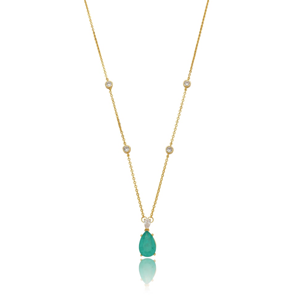 Colar corrente banho de ouro com pingente fixo de cristal fusion na cor verde (esmeralda) em gota e zircônia na cor branco (cristal).