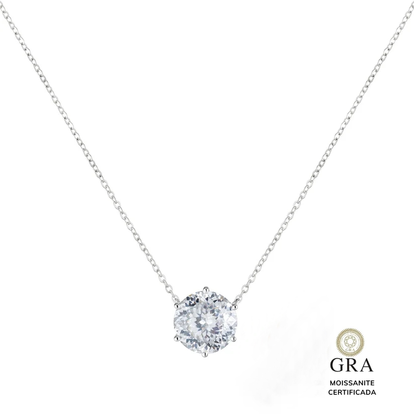 Clássico e elegante, o Colar Ponto de Luz Moissanite 5.0 ct apresenta uma deslumbrante pedra central de 11 mm, fixada por seis garras que realçam seu brilho incomparável. Confeccionado em prata 925 com banho de ródio, é uma joia que combina delicadeza e sofisticação.
