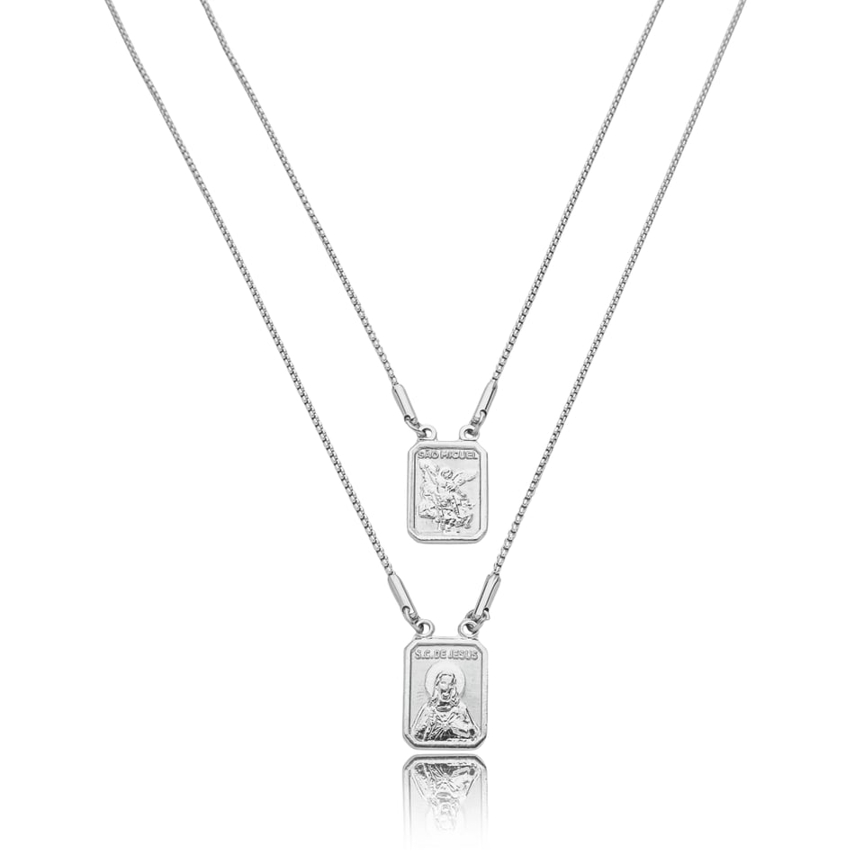 Colar corrente escapulário de aço inoxidável (antialérgico) com medalhas de São Miguel e Sagrado Coração de Jesus.