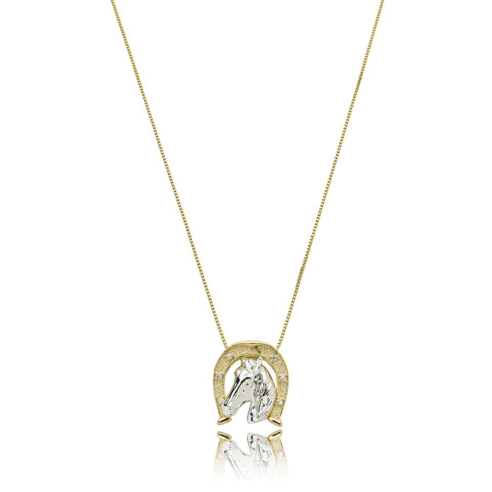 Colar corrente veneziana banho de ouro com pingente de ferradura com micro zircônias cravejadas na cor branco (cristal) e cavalo no banho de ródio.
