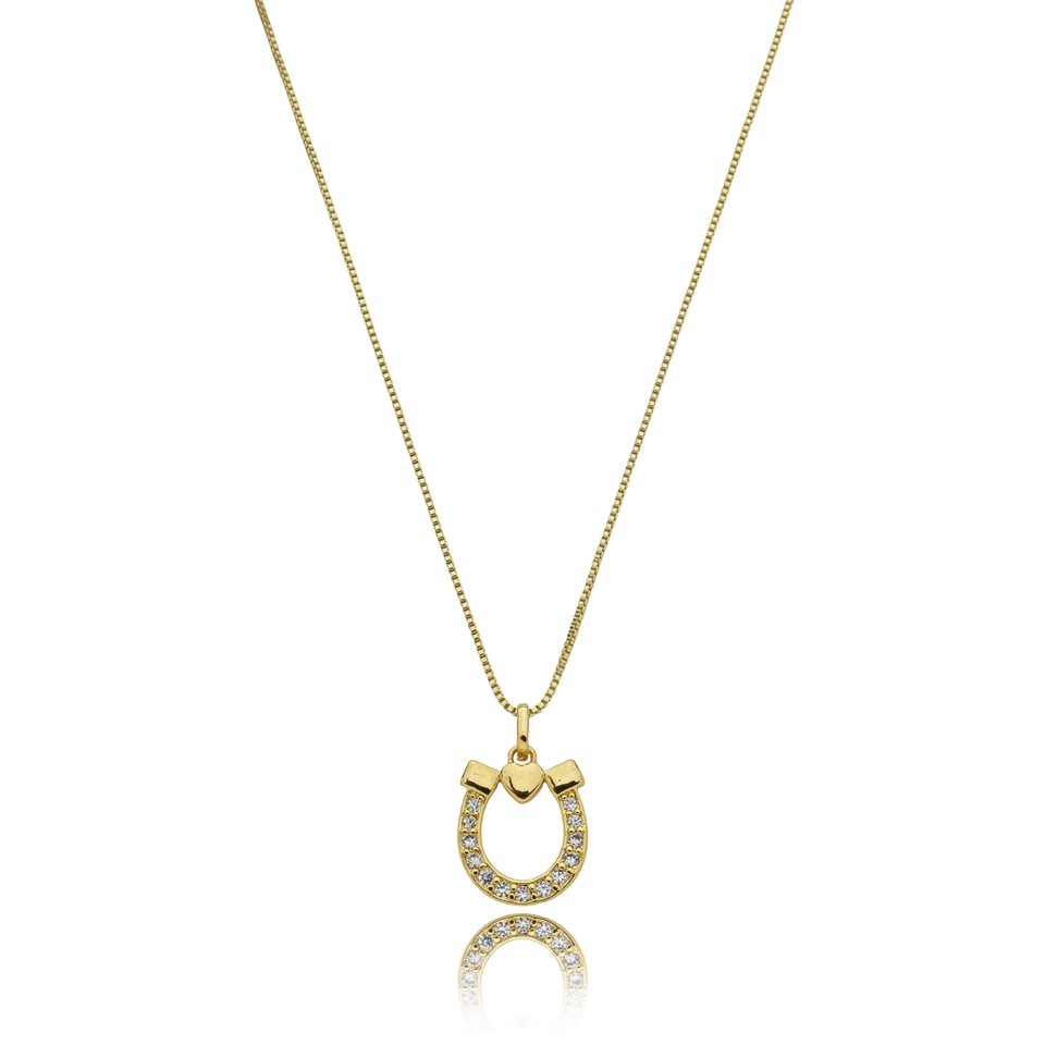 Colar corrente veneziana banho de ouro com pingente de ferradura com um pequeno coração e micro zircônias cravejadas na cor branco (cristal).