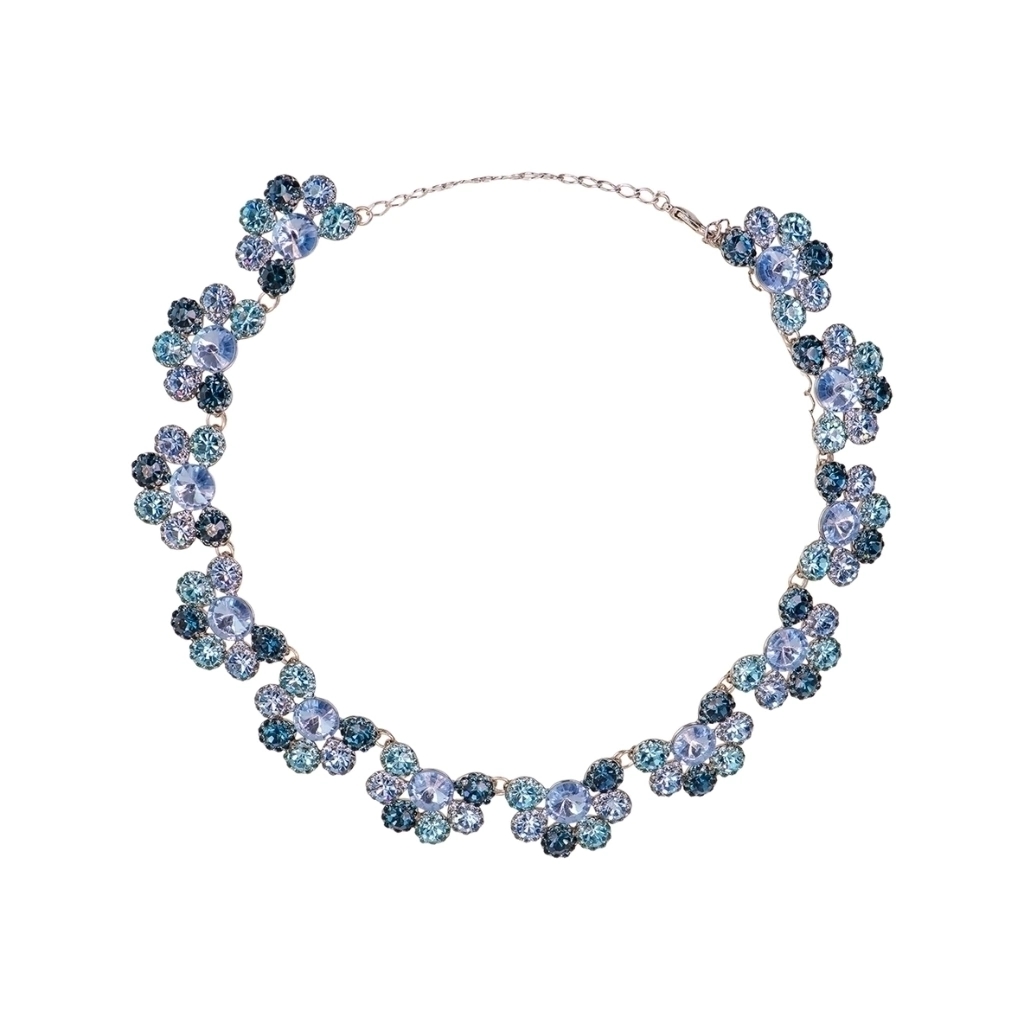 Colar banho prateado com design de meia flor e aplicação de cristais no mix azul.