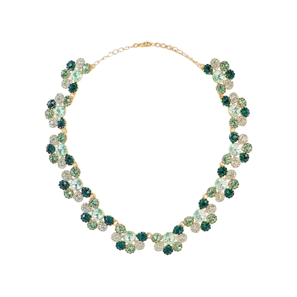 Colar banho dourado com design de meia flor e aplicação de cristais no mix verde.