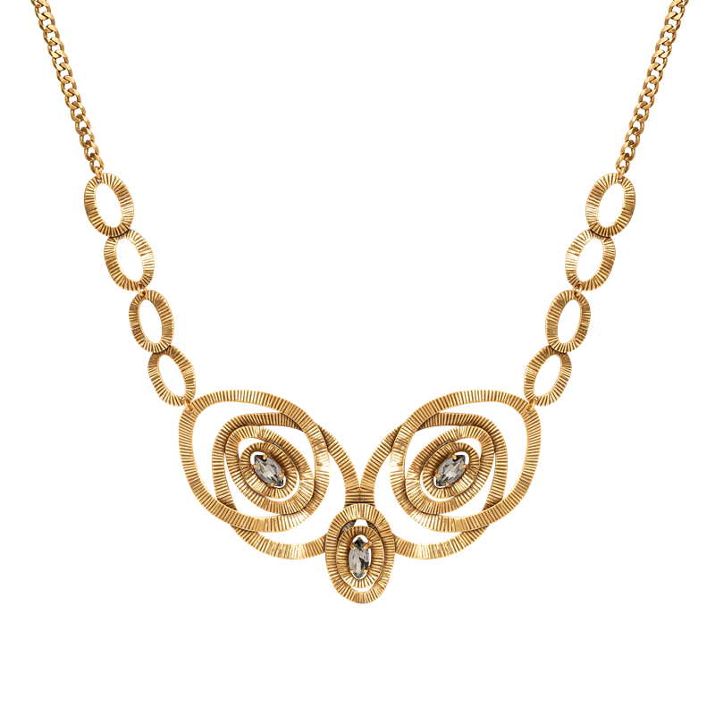 Colar Lita Raies com design marcante e composição em formas ovais entrelaçadas, trazendo um visual sofisticado e cheio de personalidade. Produzido com banho de ouro vintage, apresenta acabamento texturizado rico em detalhes e aplicação de cristais na elegante cor Black Diamond, que proporcionam brilho intenso e refinado. Níquel free, garante mais conforto e reduz o risco de alergias.