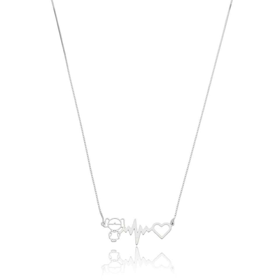 Colar prata 925 com pingente fixo de menina com batimento cardíaco e coração.