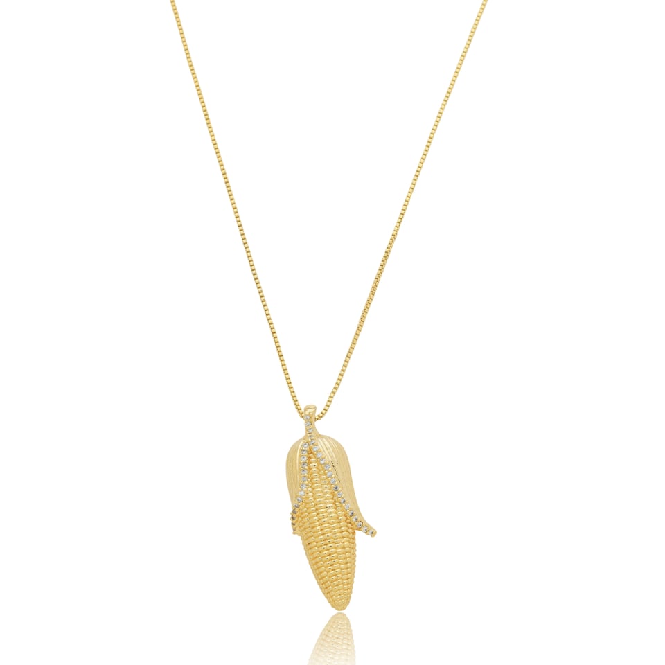 Colar banho de ouro com pingente de espiga de milho com micro zircônias cravejadas na cor branco (cristal).
