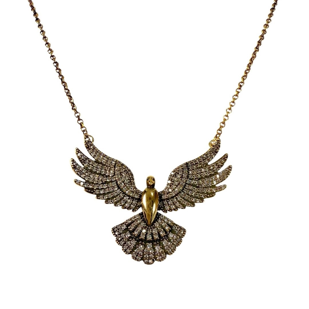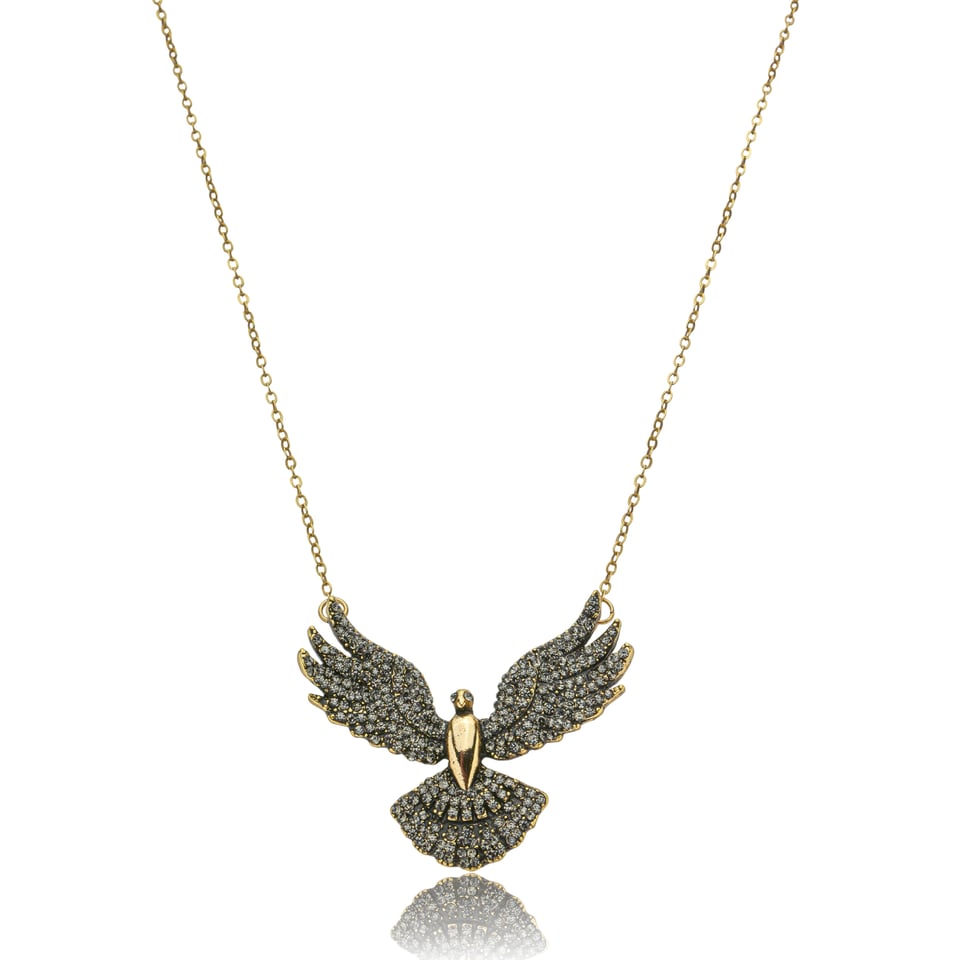 Colar Nino Bran Espírto Santo, no banho de ouro vintage, delicadamente cravejado de micro cristais na cor black diamond – uma peça especial que une espiritualidade e elegância.