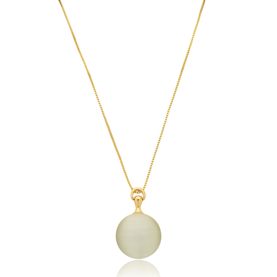 Colar banho de ouro com pingente redondo com aplicação de pedra olho de gato.