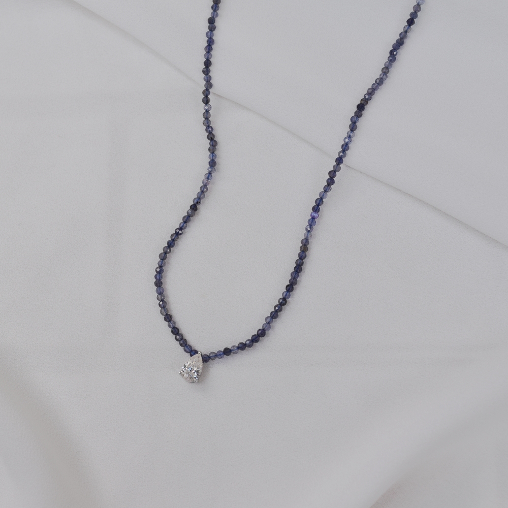 Colar pedra natural iolita com moissanite gota prata 925
