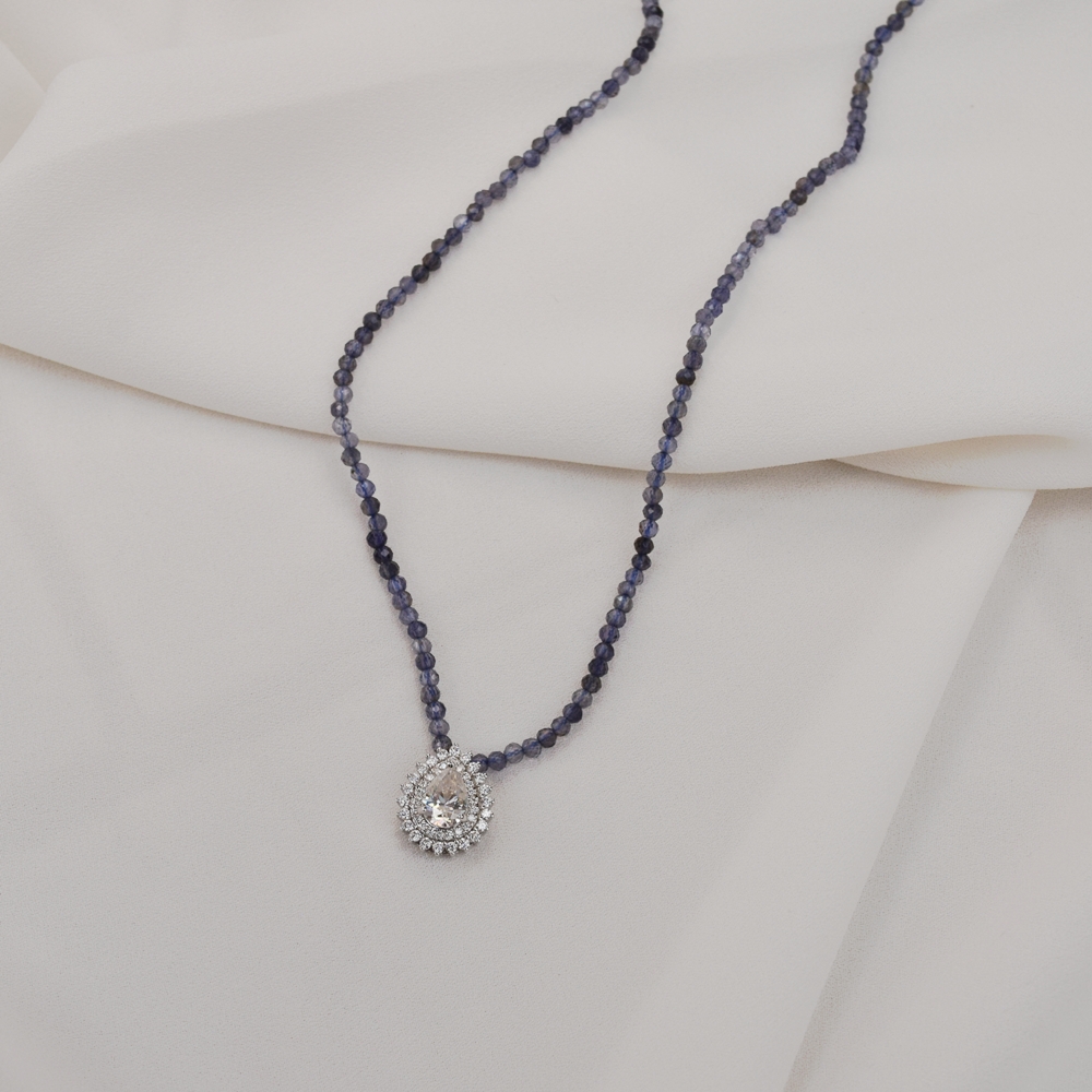 O Colar com Pedra Natural Iolita e Moissanite Gota 1,08 ct é uma joia que combina elegância, sofisticação e um toque de exclusividade. A intensidade da iolita natural traz profundidade e personalidade à peça, enquanto a moissanite em formato de gota, com 1,08 ct, adiciona um brilho excepcional e refinado.