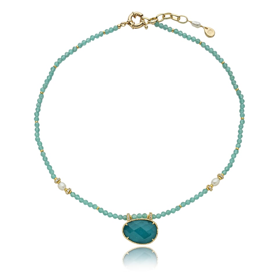 Colar curto com pedras naturais turmalina e entremeios de metal no banho de ouro e pérolas.