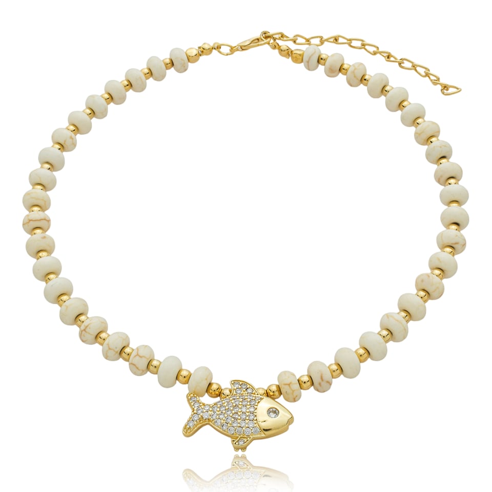 Colar de resina na cor bege com entremeios de esfera no banho de ouro e pingente fixo de peixe com micro zircônias cravejadas na cor branco (cristal).