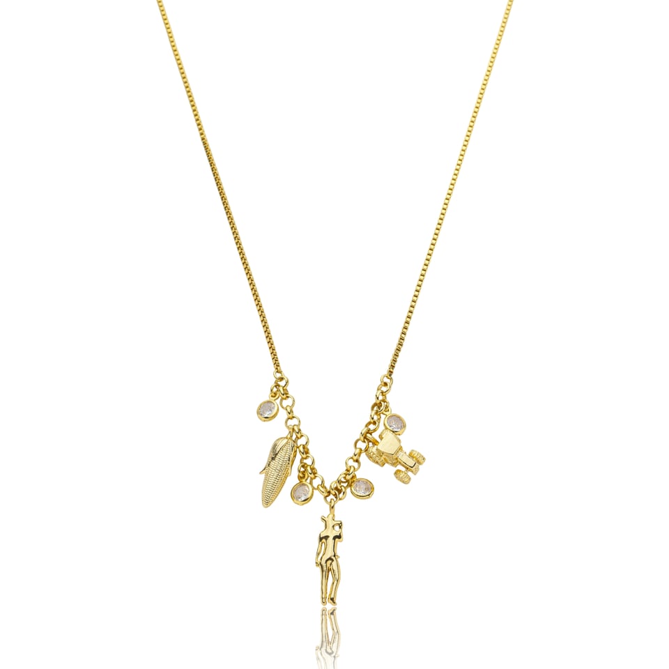 Colar corrente banho de ouro com penduricalhos de pingentes de milho, cowgirl, trator e cristais redondos na cor branco (cristal).