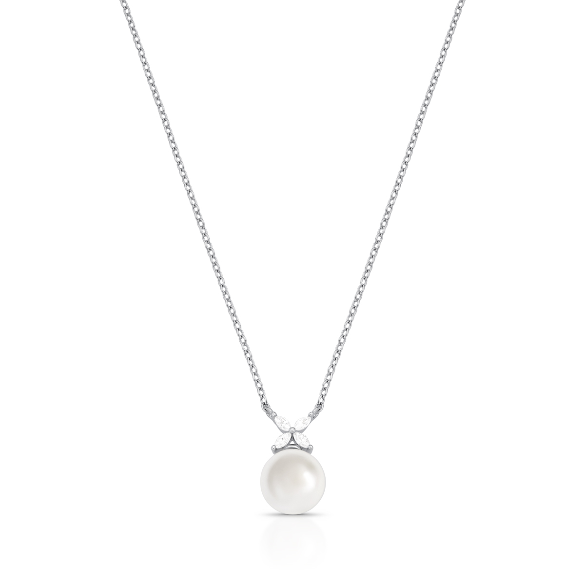 Colar corrente elos português em prata 925 com banho de ródio; pingente de flor com zircônias navetes na cor branco (cristal) e pérola shell.