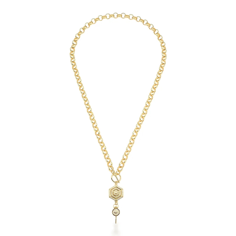 Colar corrente de elos português banho de ouro com pingente hexagonal e pingente com design de chave e rosa dos ventos cravejados com zircônias na cor branco (cristal).