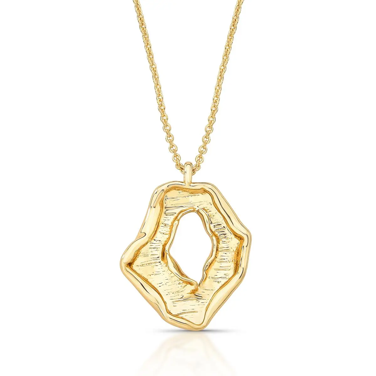 O colar banhado a ouro com pingente oval é uma semijoia elegante que combina delicadeza e sofisticação em um design contemporâneo. O pingente apresenta formato oval trabalhado e vazado, com linhas curvas que criam um visual leve e harmonioso, valorizando a beleza da peça.