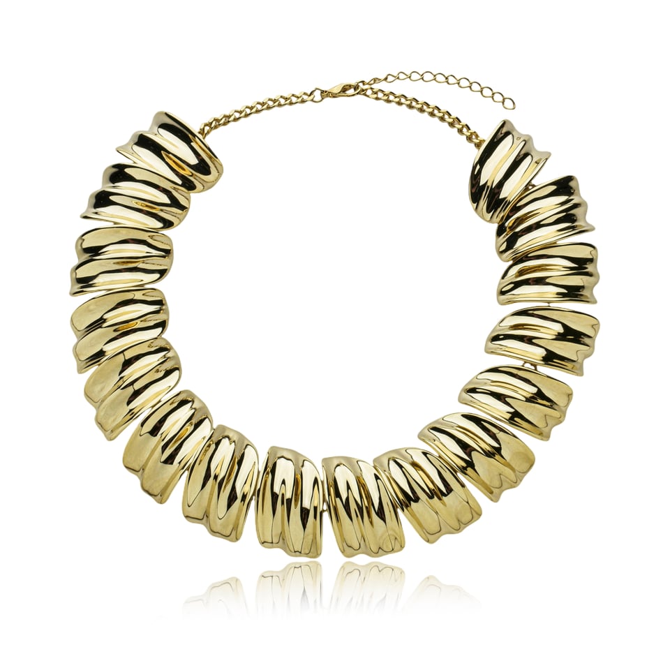 Colar banho de ouro com placas curvadas no metal liso polido.