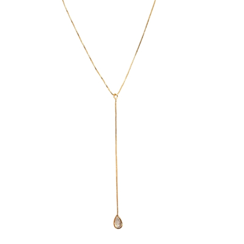 Delicado e elegante, o colar de corrente banhado a ouro é uma semijoia clássica que valoriza o brilho na medida certa. A peça apresenta um ponto de luz com Zircônia em gota na cor branca (cristal), que reflete a luz com intensidade e sofisticação.