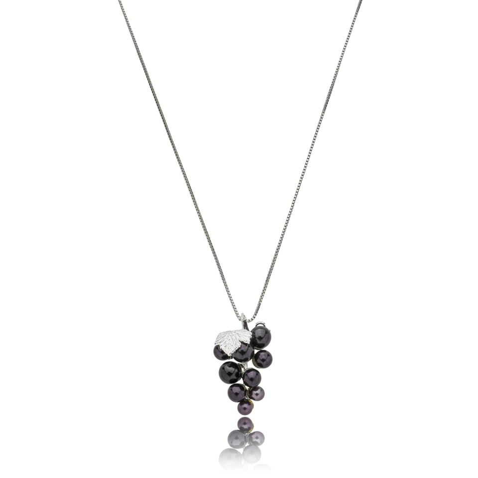 Colar corrente veneziana banho de ródio no formato de uva com pérolas na cor roxa, cravação de uma micro zircônia na cor branco (cristal) e folha no metal.