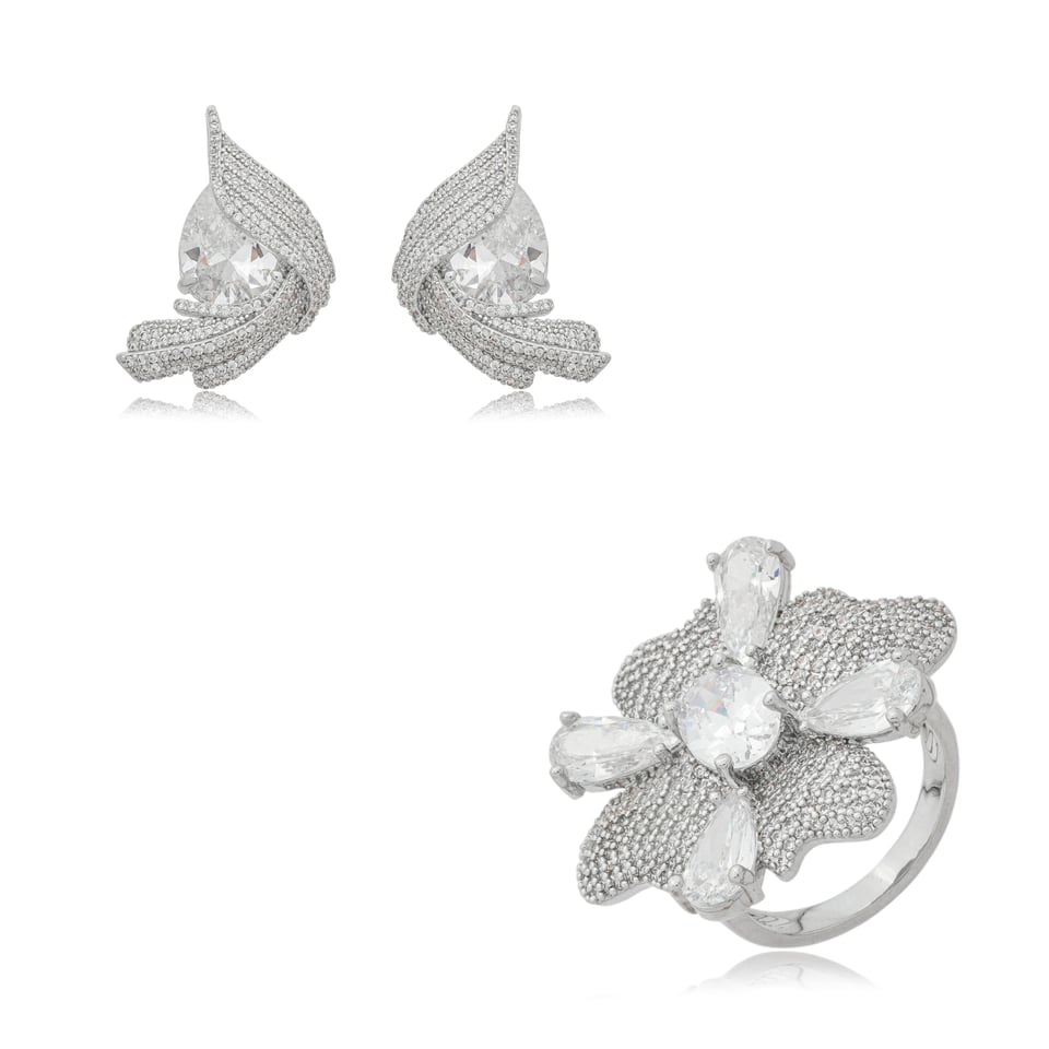 Conjunto de brinco e anel banho de ródio com micro zircônias cravejadas na cor branco (cristal).