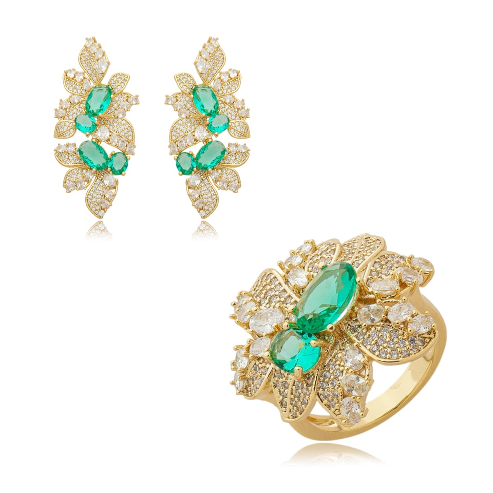 Conjunto de brinco e anel banho de ouro com design de folhas e cravação de micro zircônias na cor branco (cristal) e zircônias na cor verde.