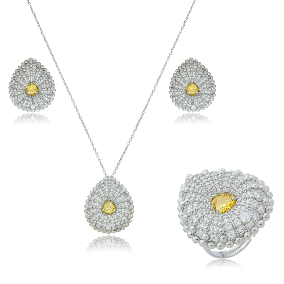 Conjunto de colar, brinco e anel ajustável no banho de ródio com micro zircônias cravejadas na cor branco (cristal) e zircônia no formato de coração na cor amarelo.