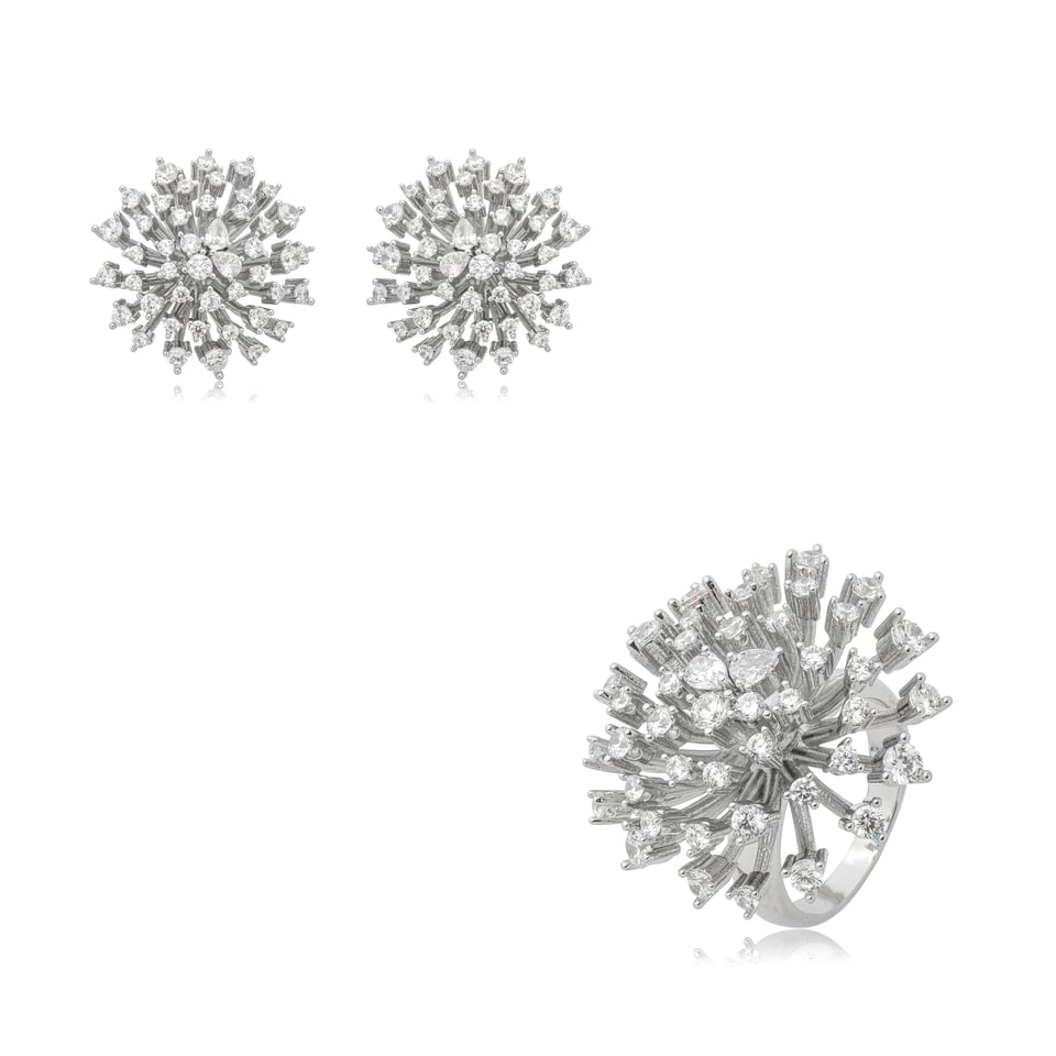 Elegante e sofisticado, o conjunto de brinco e anel estilo chuveiro é composto por zircônias cravejadas de alto brilho, que refletem a luz com intensidade e realçam a beleza da peça. O banho de ródio proporciona acabamento moderno, durabilidade e um brilho refinado.