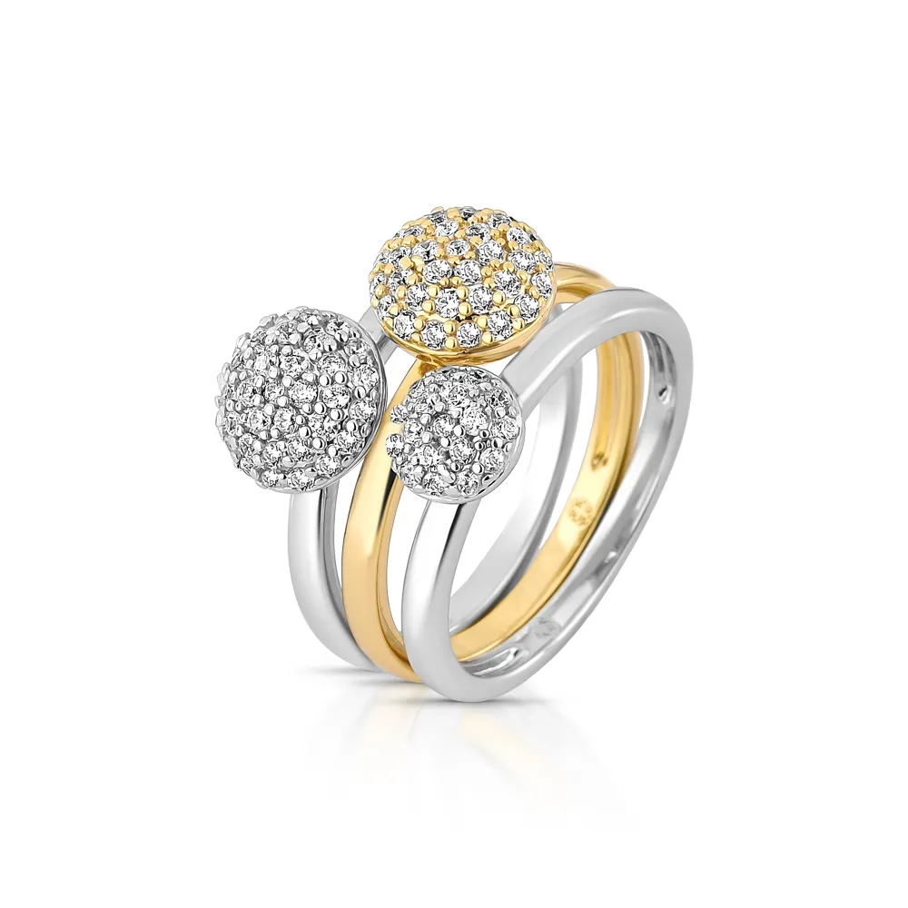 Kit de 3 anéis, sendo dois de banho de ródio e um no banho de ouro com micro zircônias cravejadas na cor branco (cristal).
