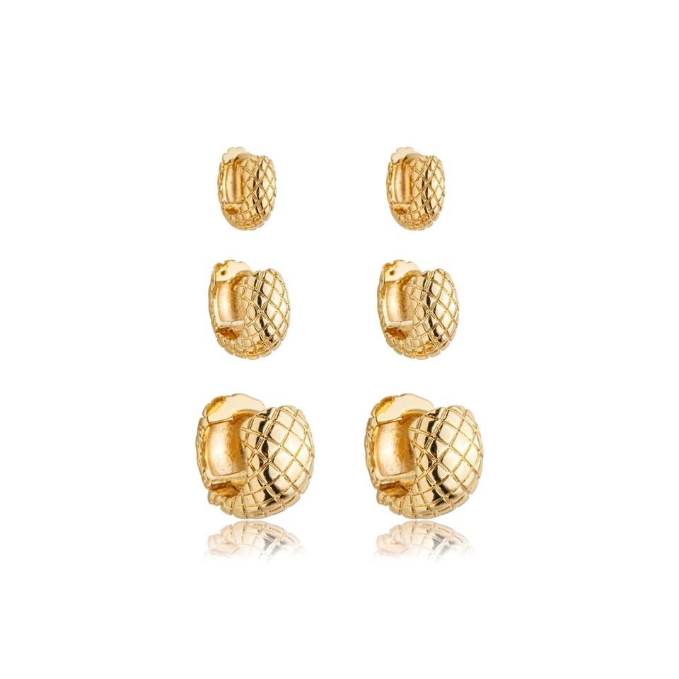 Charmoso e versátil, este kit com 3 brincos de argolinhas em banho de ouro traz o toque sofisticado do metal texturizado. Com tamanhos variados, permite múltiplas combinações — use separadas para um visual discreto ou juntas para um efeito moderno e cheio de personalidade.
