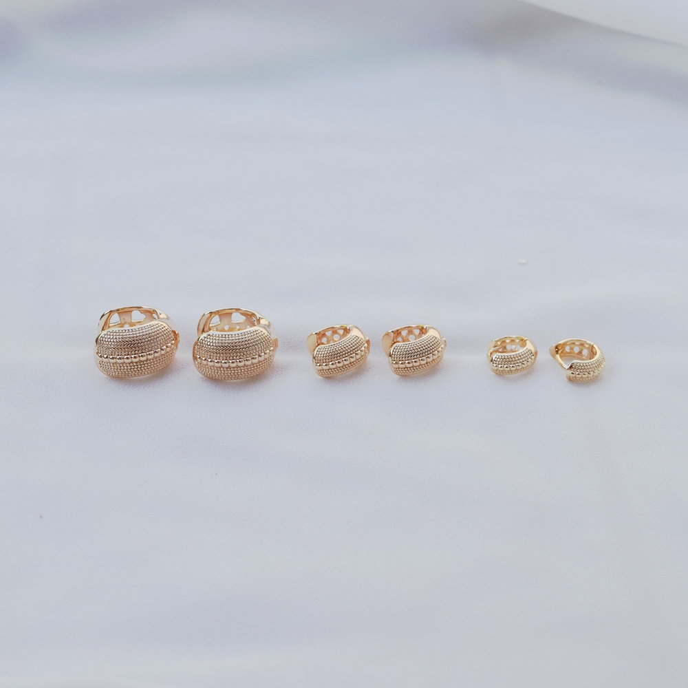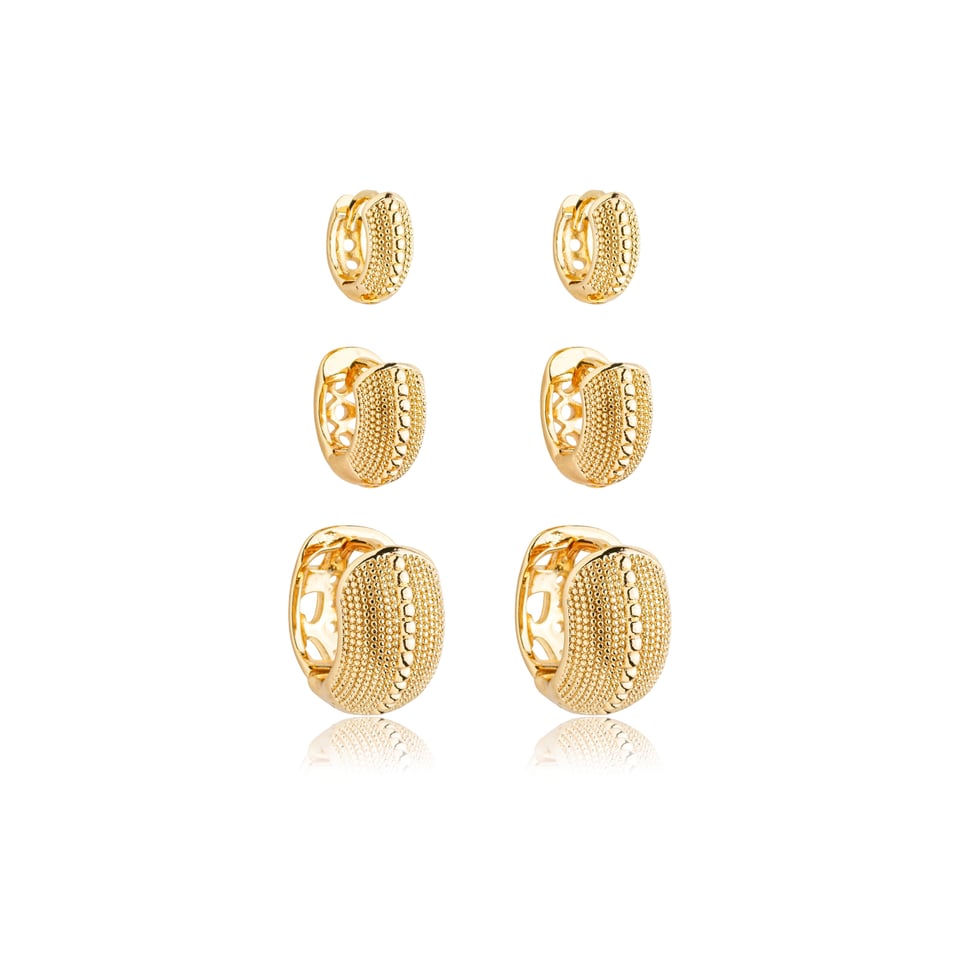 Charmoso e versátil, este kit com 3 brincos de argolinhas em banho de ouro traz o toque sofisticado do metal texturizado. Com tamanhos variados, permite múltiplas combinações — use separadas para um visual discreto ou juntas para um efeito moderno e cheio de personalidade.