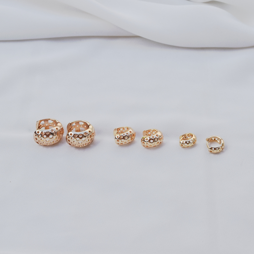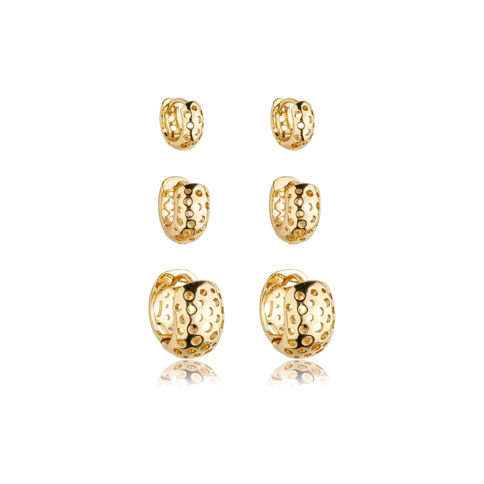 Moderno e versátil, este kit com 3 brincos de argolinhas semijoias em banho de ouro apresenta um design de metal vazado que adiciona leveza e estilo. As diferentes proporções permitem composições variadas — use separadas para um look delicado ou combine todas para um visual contemporâneo e cheio de atitude.