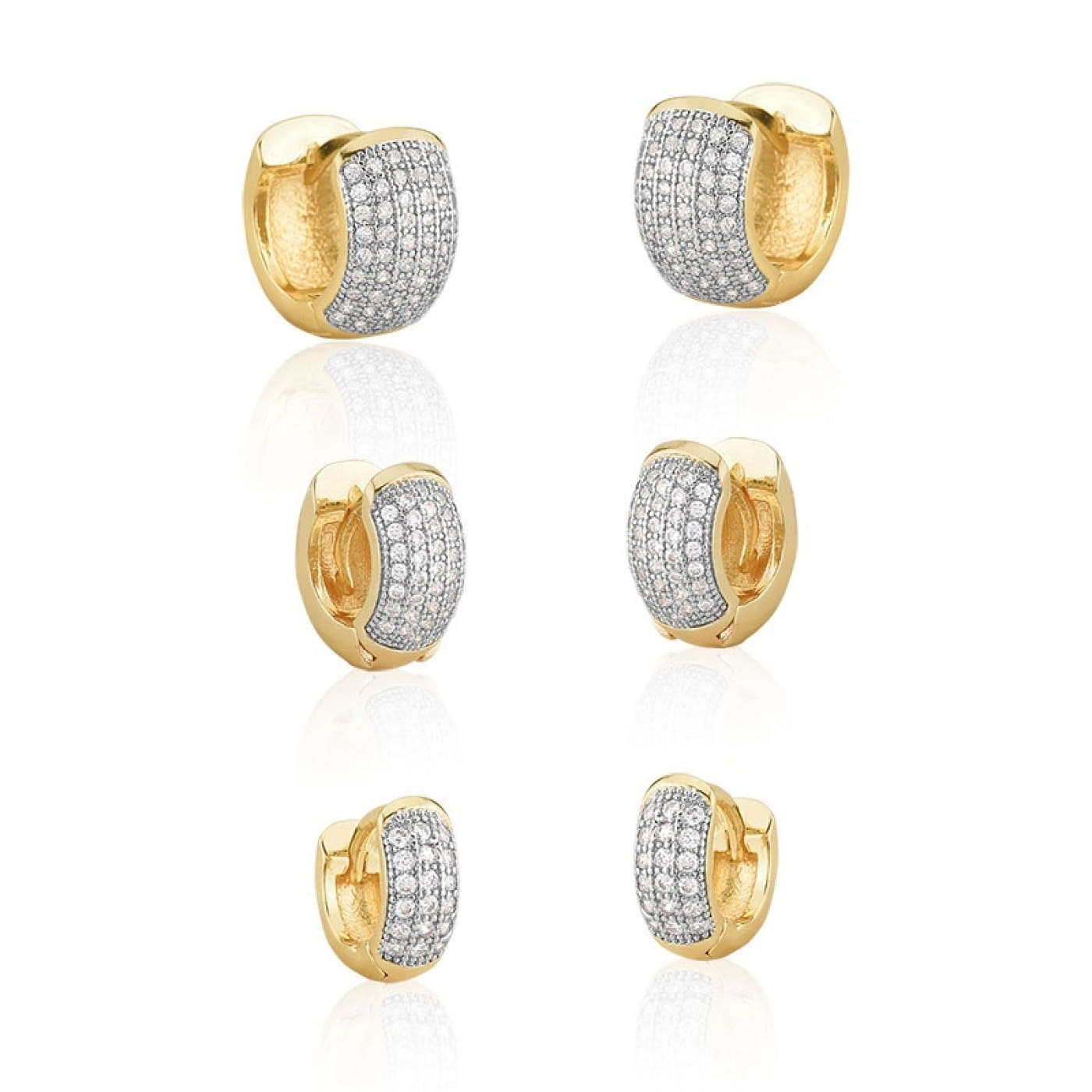 Kit com 3 brincos argolinhas banho de ouro com micro zircônias cravejadas na cor branco (cristal).