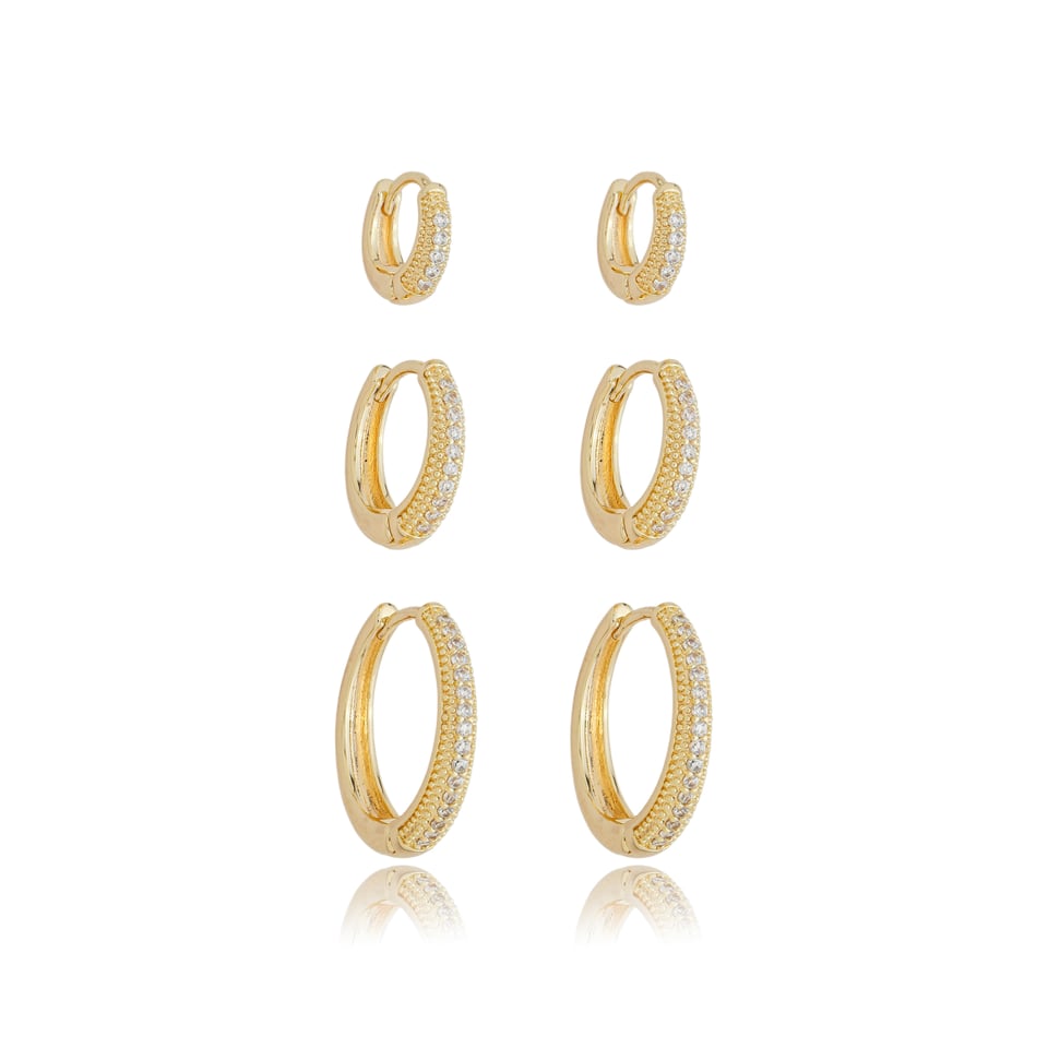 Kit com 3 brincos argolinhas banho de ouro com micro zircônias cravejadas na cor branco (cristal).