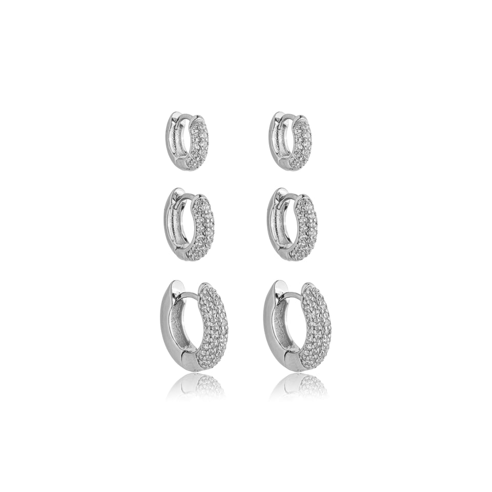 Versátil e delicado, este kit com 3 Brincos de argolinhas semijoias em banho de ródio traz o brilho sutil das micro zircônias. Perfeito para usar juntos em composições modernas ou separados, criando combinações que vão do dia a dia a produções mais sofisticadas.