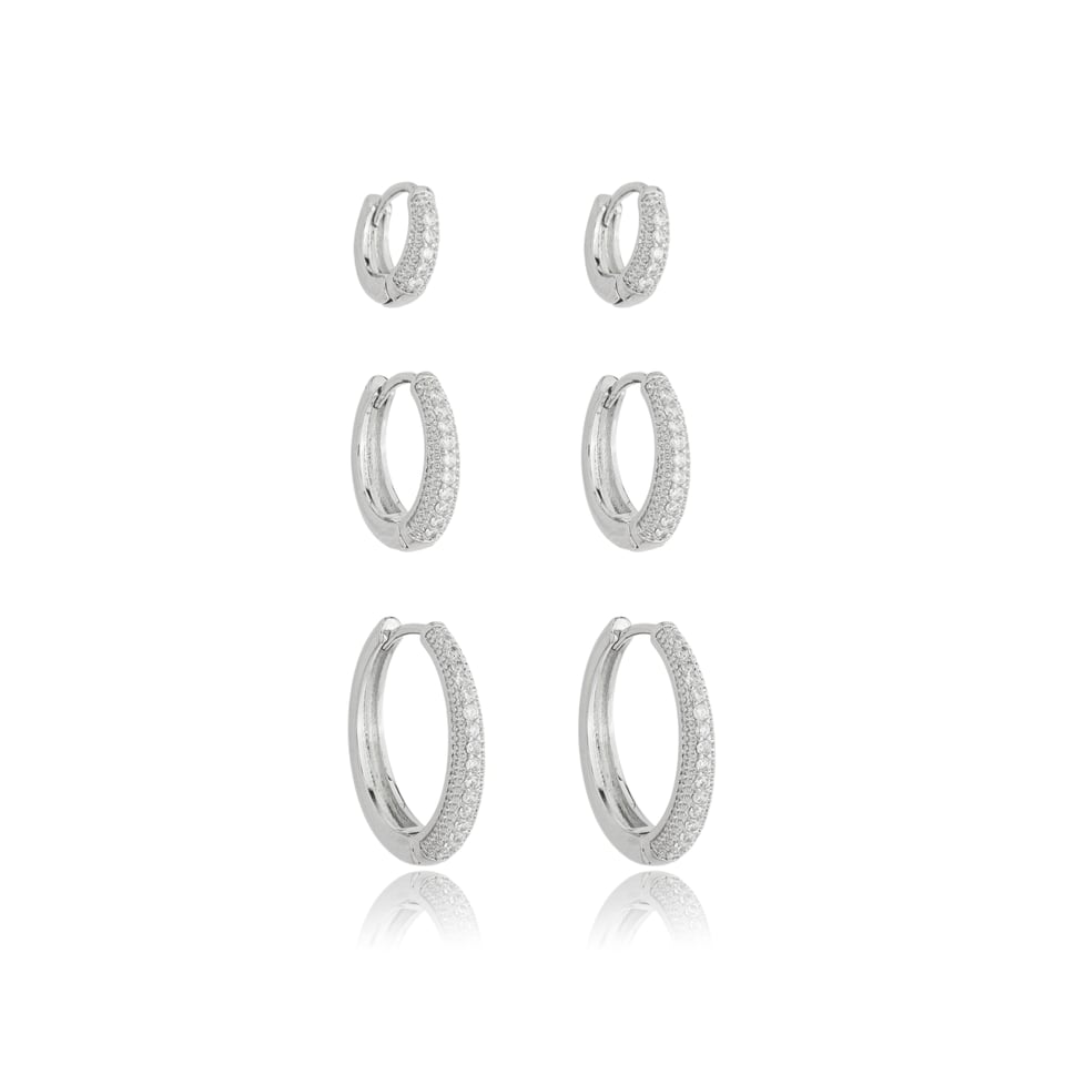 Kit com 3 brincos argolinhas banho de ródio com micro zircônias cravejadas na cor branco (cristal).