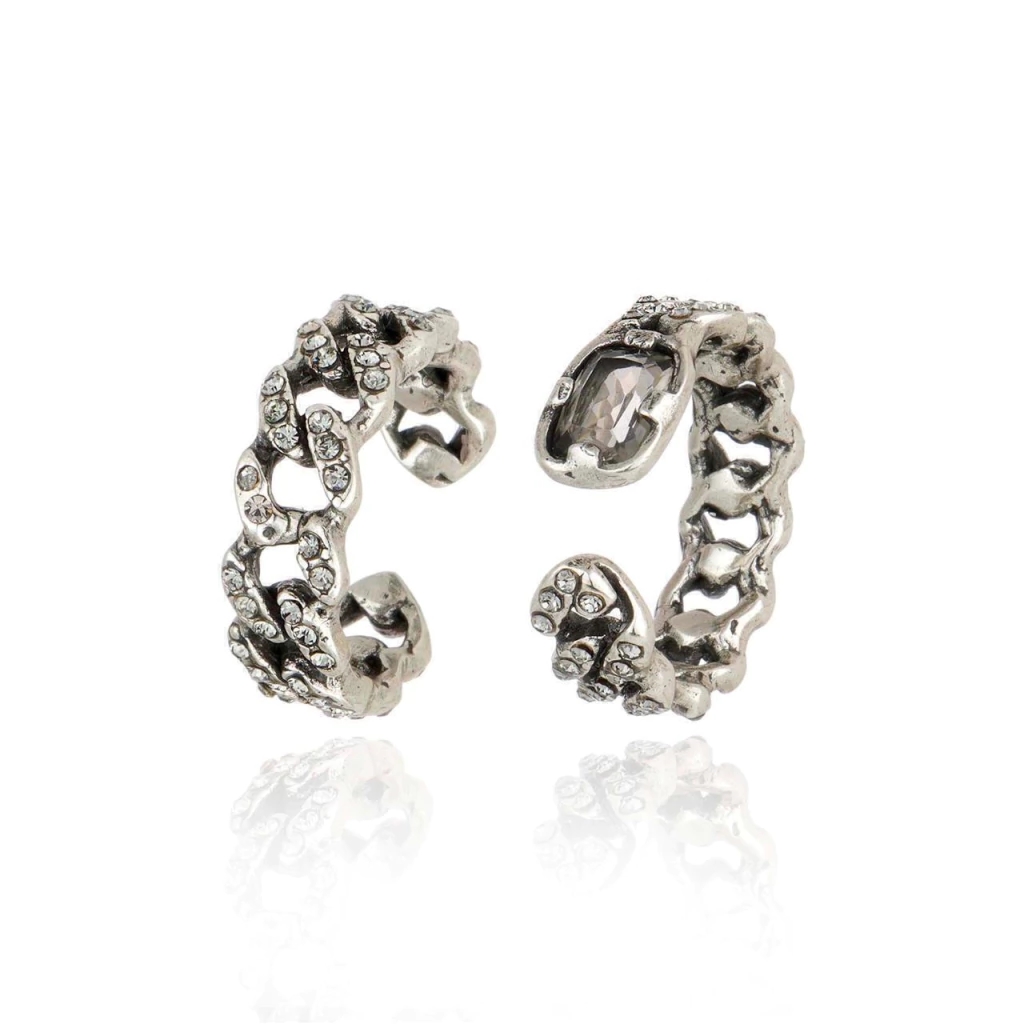 Anel ajustável banho de prata vintage com design de correntaria e aplicação de cristais na cor branco (cristal).