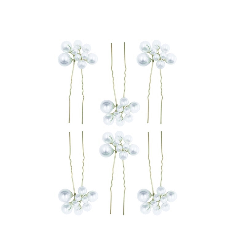 Grampos para penteados no metal dourado com aplicação de pérolas sintéticas.