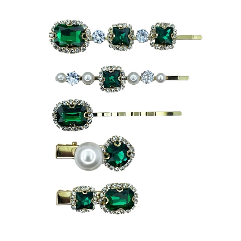 Kit com 3 grampos e 2 presilhas bico de pato metal dourado com aplicações de cristais na cor verde, branco (cristal) e pérolas.
