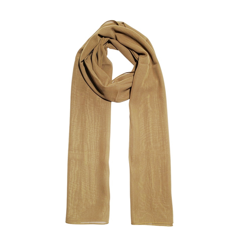 Lenço tipo echarpe em tecido 100% poliéster na cor bege, com toque macio e caimento leve. Elegante e versátil, é perfeito para complementar produções com sofisticação e neutralidade, podendo ser usado no pescoço, ombros ou como acessório de bolsa.