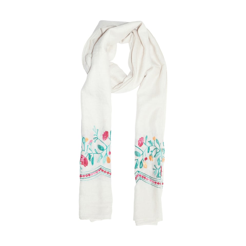 Lenço tipo echarpe de tecido 100 % poliéster com bordado floral.