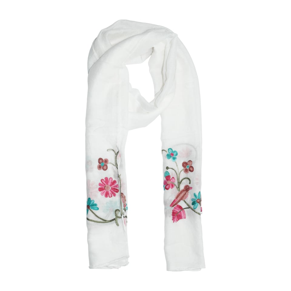 Lenço tipo echarpe de tecido 80% poliéster e 20% algodão com bordados de pássaros e flores.