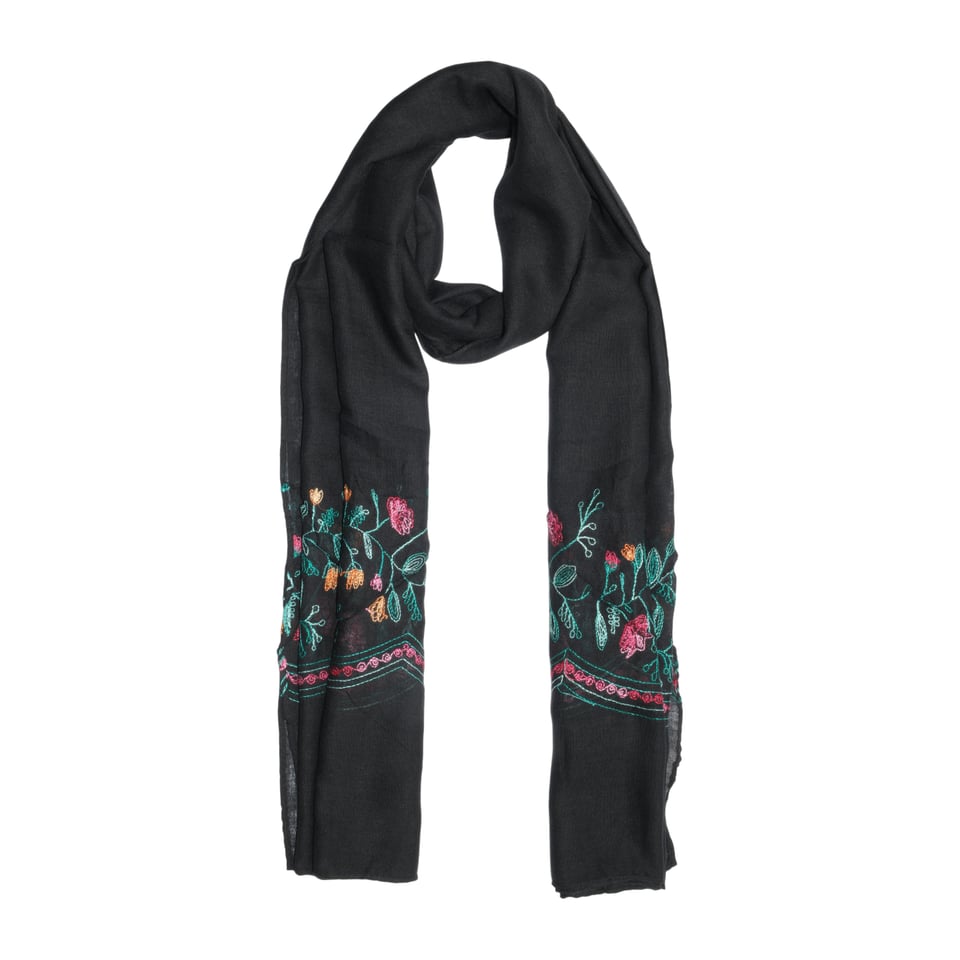 Lenço tipo echarpe de tecido 100 % poliéster com bordado floral.