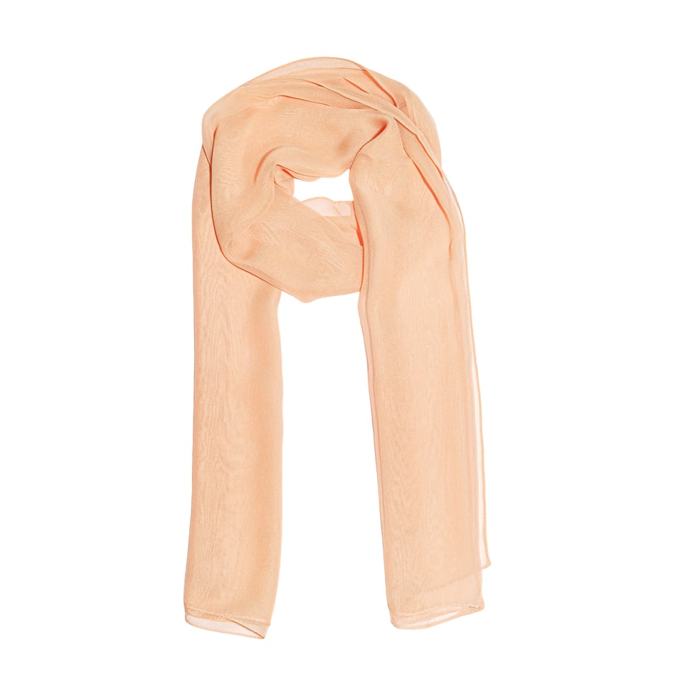 Lenço tipo echarpe de tecido 100% poliéster na cor salmão.