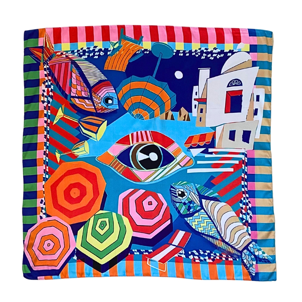 Lenço quadrado em cetim seco soft com estampa inspirada no mar Mediterrâneo.