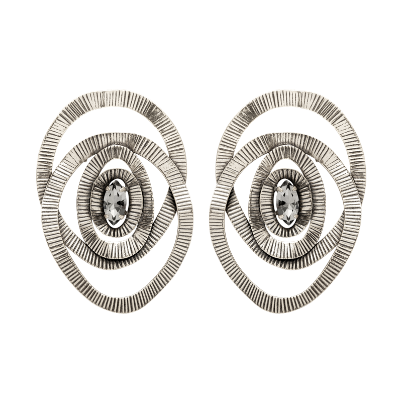 Maxi brinco Lita Raies com design entrelaçado em formas ovais texturizadas, uma semijoia marcante que une elegância e personalidade. Produzido com banho de prata vintage, apresenta acabamento rico em detalhes e aplicação de cristal na sofisticada cor Black Diamond, que confere brilho intenso e um toque moderno à peça.