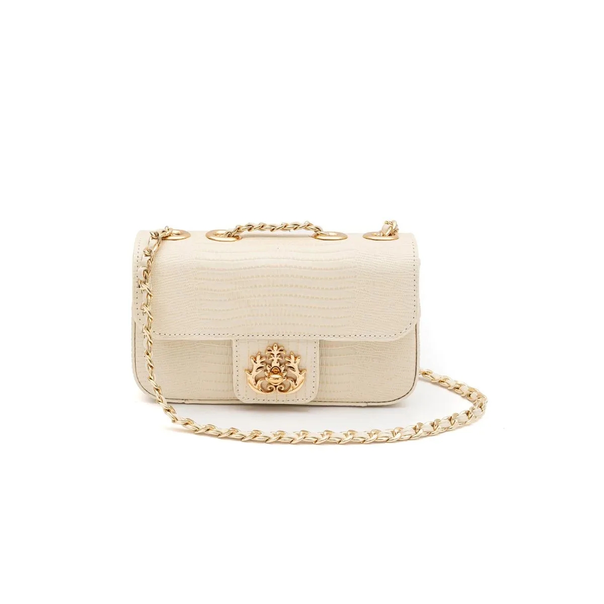 Seu formato baguete traz um ar atual e elegante. A alça longa de metal com tiras de couro entre os elos é um destaque à parte, combinando estilo e inovação no design.