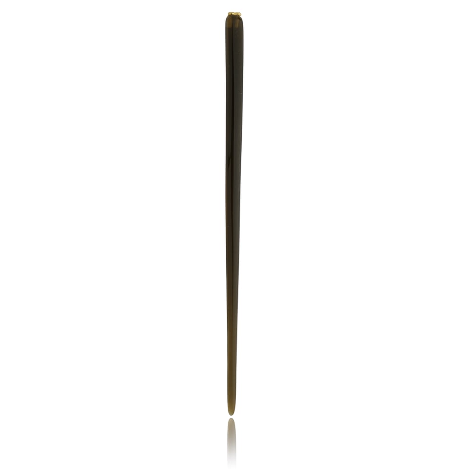 Palito de acrílico resistente na cor marrom tartaruga com acabamento feito a mão para não danificar e nem marcar o cabelo.
