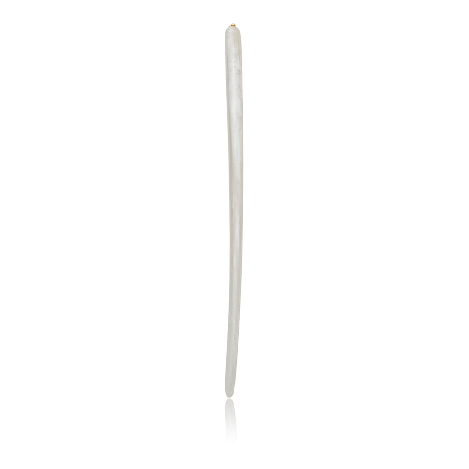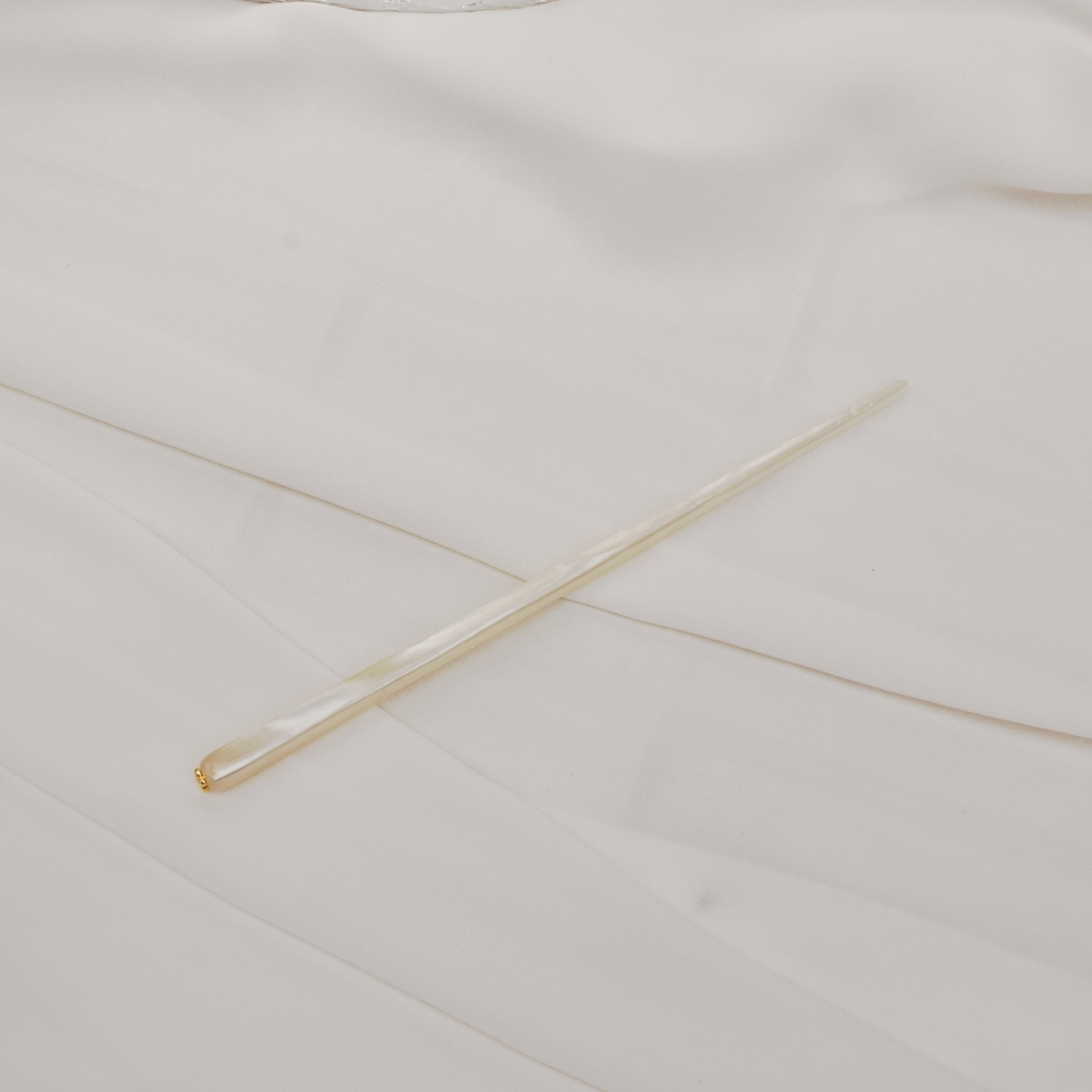 Palito de acrílico resistente na cor marfim imitando madrepérola com acabamento feito a mão para não danificar e nem marcar o cabelo.