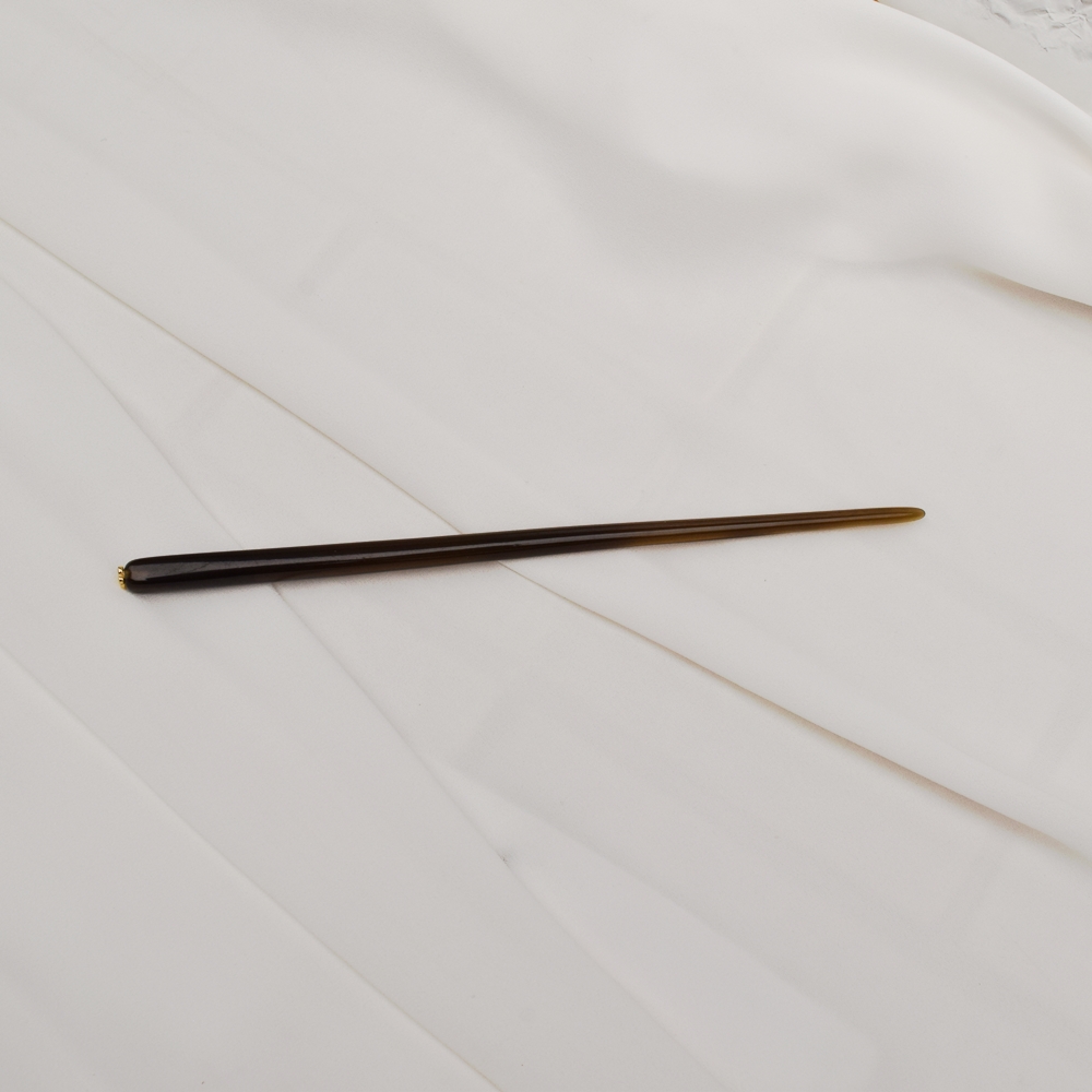Palito de acrílico resistente na cor marrom tartaruga com acabamento feito a mão para não danificar e nem marcar o cabelo.