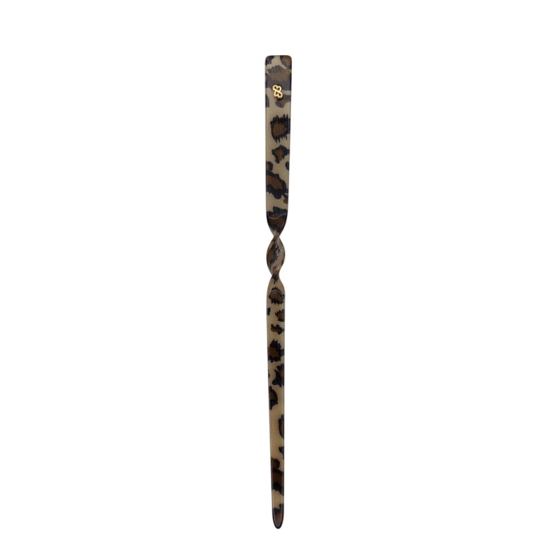 Palito de acrílico resistente com design curvado na estampa animal print com acabamento feito a mão para não danificar e nem marcar o cabelo.